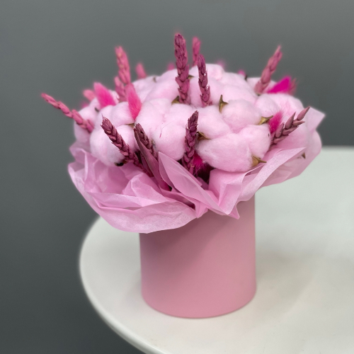 Композиция в шляпной коробке мини из хлопка, пшеницы и лагуруса